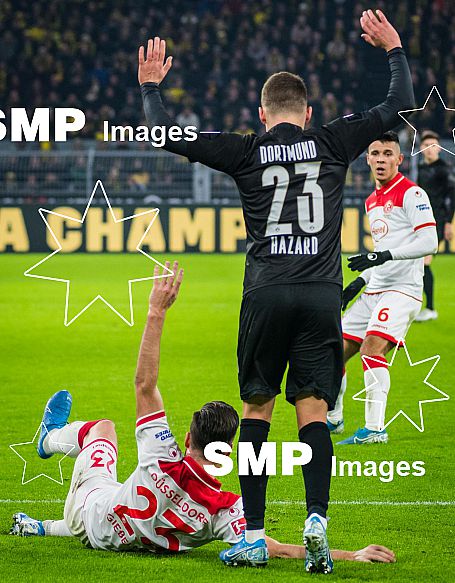 - Description: Borussia Dortmund's Thorgan Hazard is called for the foul on Fortuna Düsseldorf's Niko Giesselmann.