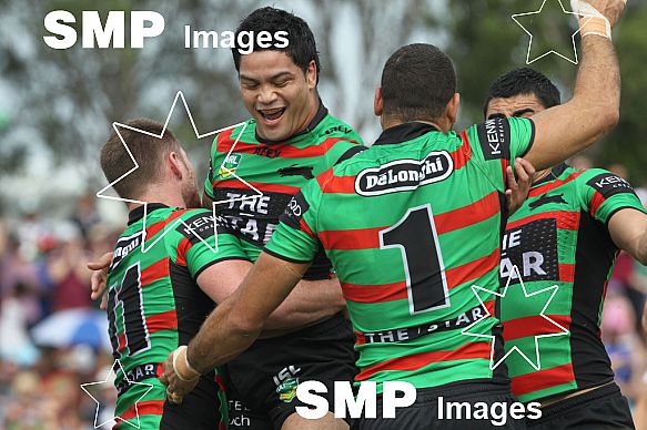 - Description: Issac Luke up high as Souths celebrate their opening try: NRL Rugby League, Round 14 South Sydney Rabbitohs v Gold Coast Titans at Barlow Park, Cairns, Sunday June 16th 2013. Digital image by Colin Whelan © nrlphotos.com